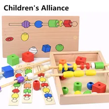 חידת חרוזים לילדים תיבה, הוראת מונטסורי עץ מסייעת צעצועי תיאום יד-עין אימון זיכרון צבע וצורה קוגניטיבית